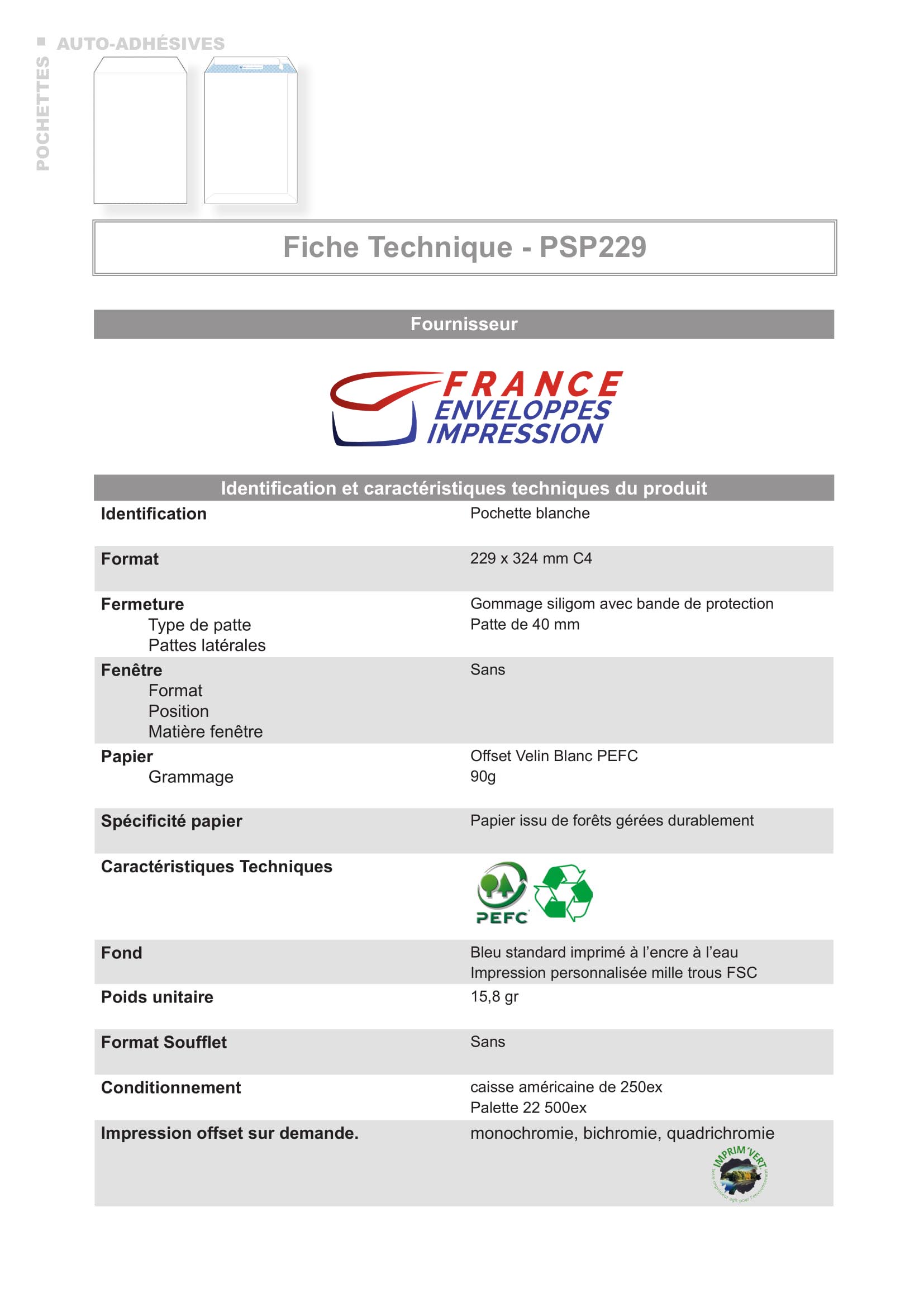 Pochette blanche C4 – 229x324mm – Sans Fenêtre